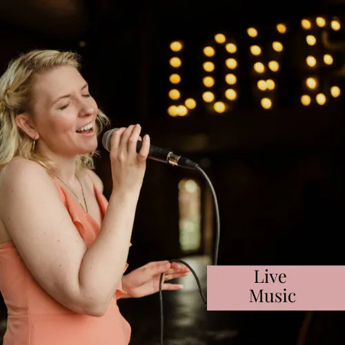 Let the music and drinks flow as our talented wedding singer, Rebecca, serenades you with a wonderful selection of songs that are perfect for your wedding. Picture these melodies weaving seamlessly into your own special day, adding a touch of magic to every moment.